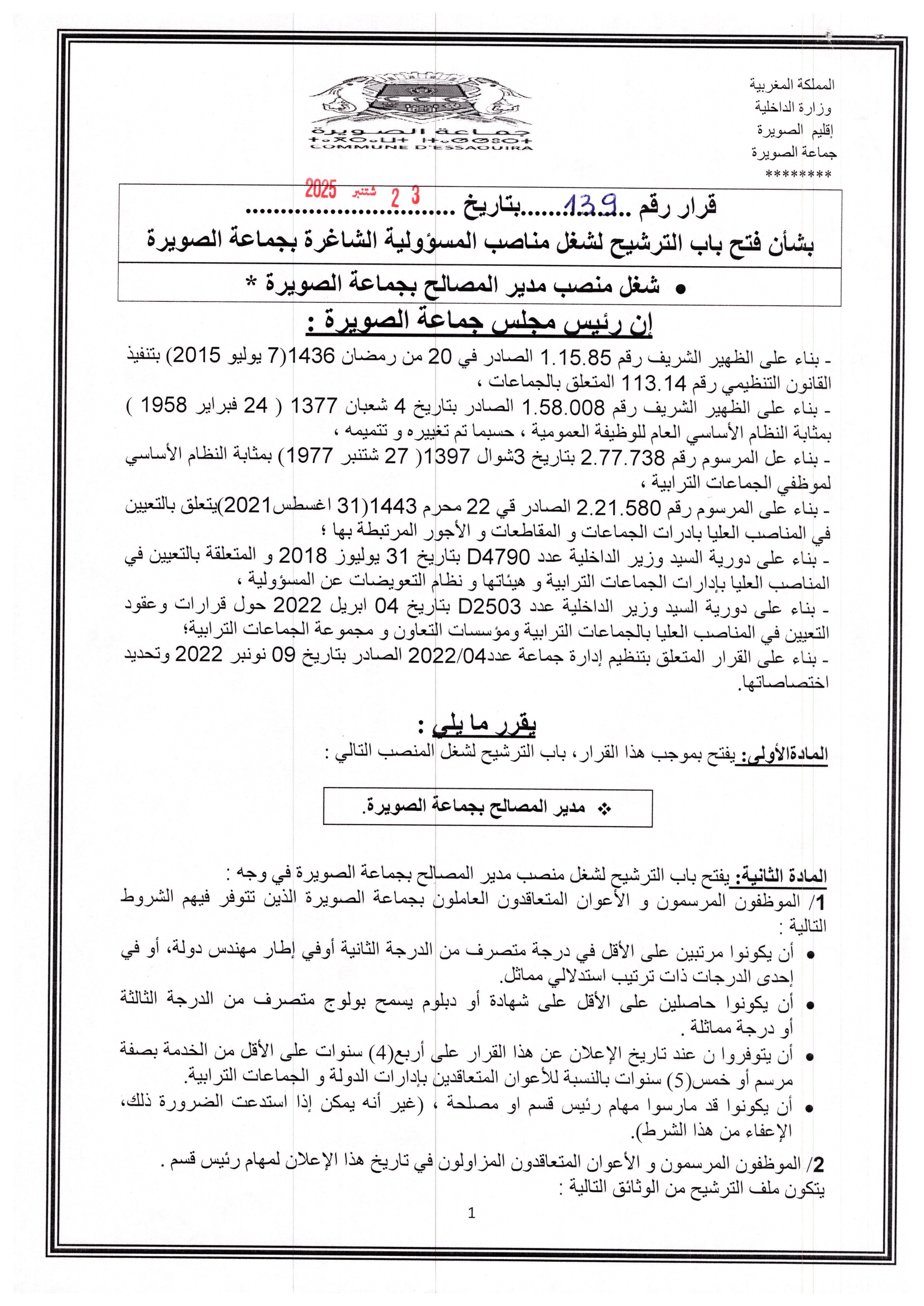 فتح باب الترشيح لشغل منصب مدير المصالح بجماعة الصويرة